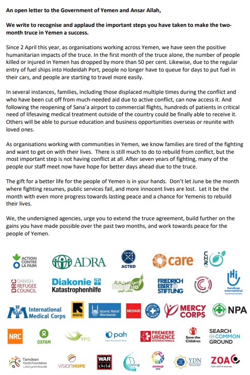 In een brief omschrijven ook de gezamenlijke hulporganisaties de afgelopen twee maanden daarom als een zucht van verlichting. Ze roepen de strijdende partijen in dezelfde brief met klem op het bestand te verlengen. Gisteren brachten de Europese ambassadeurs daartoe al een bezoek aan Aden, de Jemenitische havenstad waar de verjaagde regering kantoor houdt.